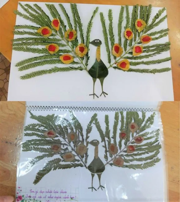 Dưới sự hướng dẫn của cô giáo Đặng Thị Chung, sau những giờ học, về nhà Vân và Ánh chia nhau thu thập những loài lá cây có hình dáng phù hợp với ý tưởng tạo hình các con vật của mình.