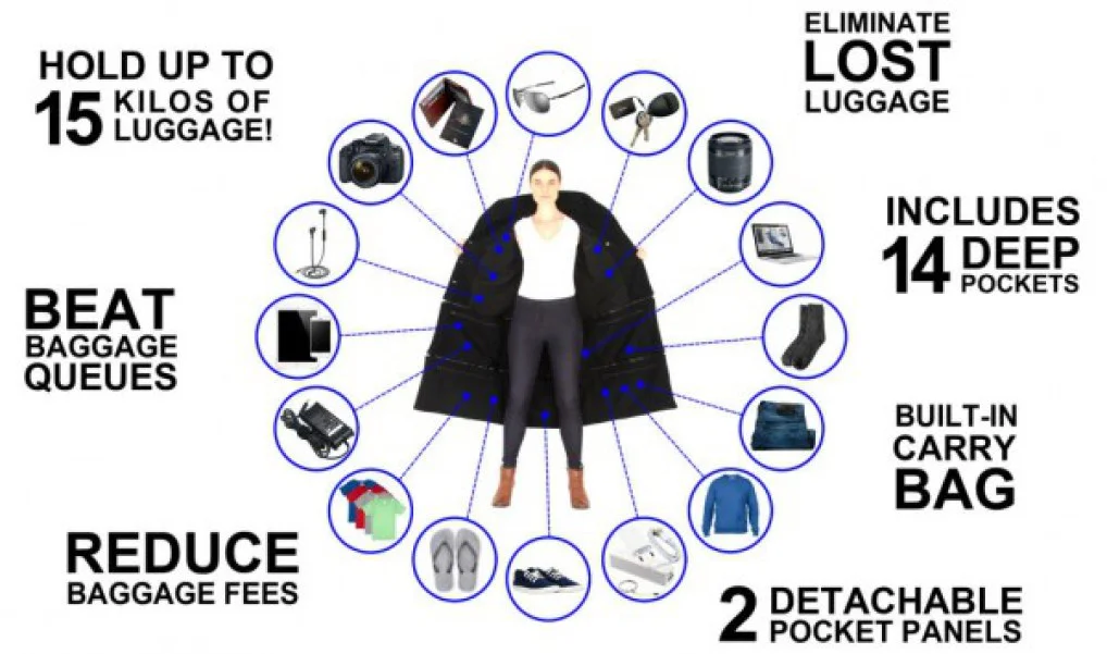 "Khi các hãng hàng không bắt đầu tính phí đối với hành lý xách tay vượt quá khối lượng quy định cũng như những hạn chế nghiêm ngặt về hành lý đối với hành khách mua vé giá rẻ, tôi cùng chồng đã thiết kế một chiếc áo khoác cho phép bạn mang máy tính xách tay, máy tính bảng, hai đôi giày, một chiếc quần jeans, năm chiếc áo phông, một áo liền quần và một máy ảnh,” nhà thiết kế Claire Murphy giải thích. “Áo chứa 14 túi sâu, trong đó có 8 túi bên hông, 11 túi dài ¾ áo và 14 túi dài ngang áo. Áo còn bao gồm hai túi bổ sung và một túi thể thao cỡ lớn.”