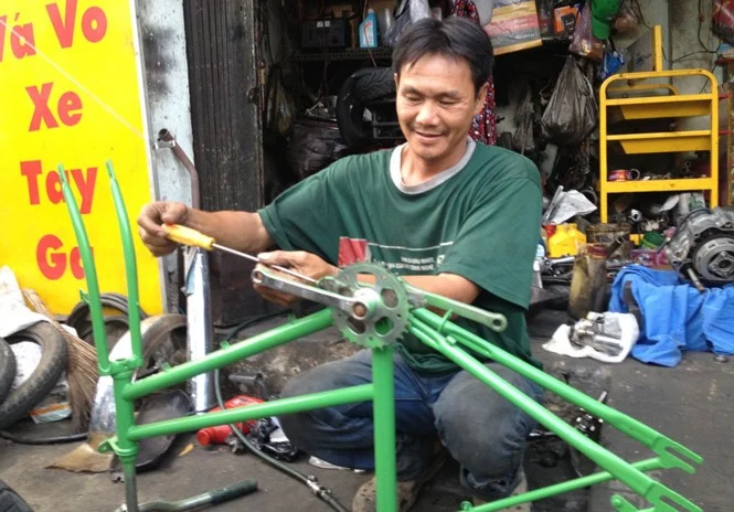 Mặc dù rất bận với công việc sửa xe máy để kiếm sống, nhưng anh Lê Văn Thái vẫn tận dụng chút thời gian rảnh đi săn lùng mua những chiếc xe đạp cũ, tranh thủ thời gian sửa sang để tặng lại cho học sinh nghèo.