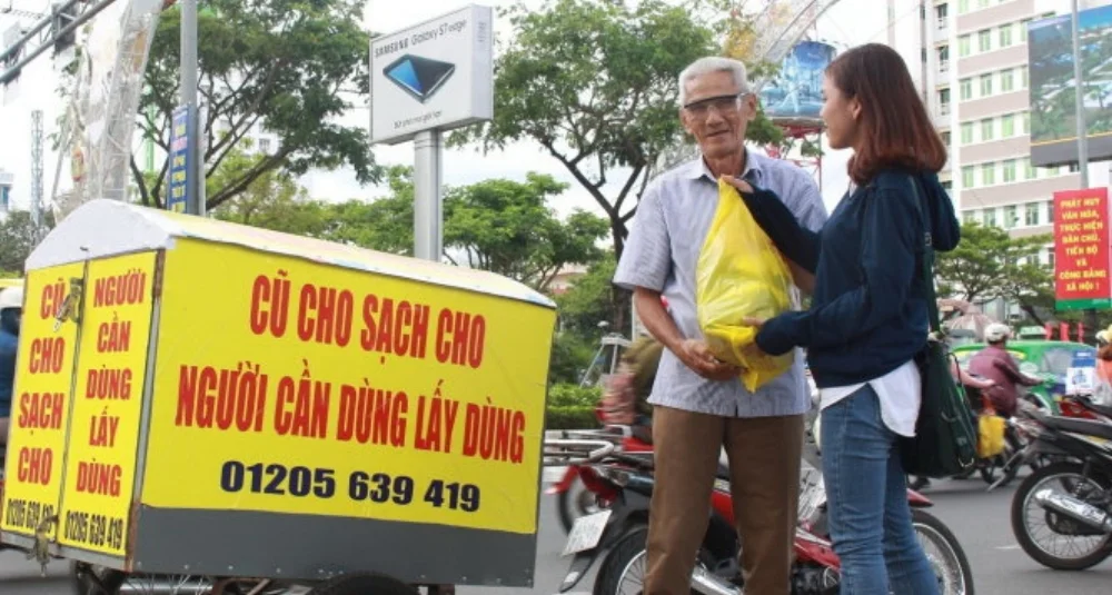 Dưới cái nắng gay gắt của ngày hè oi ả, cụ ông có gương mặt phúc hậu dừng chiếc xe máy kéo có dòng chữ “Cũ cho, sạch cho - người cần dùng lấy dùng” ở đầu đường Nguyễn Văn Linh đoạn chân cầu Rồng.