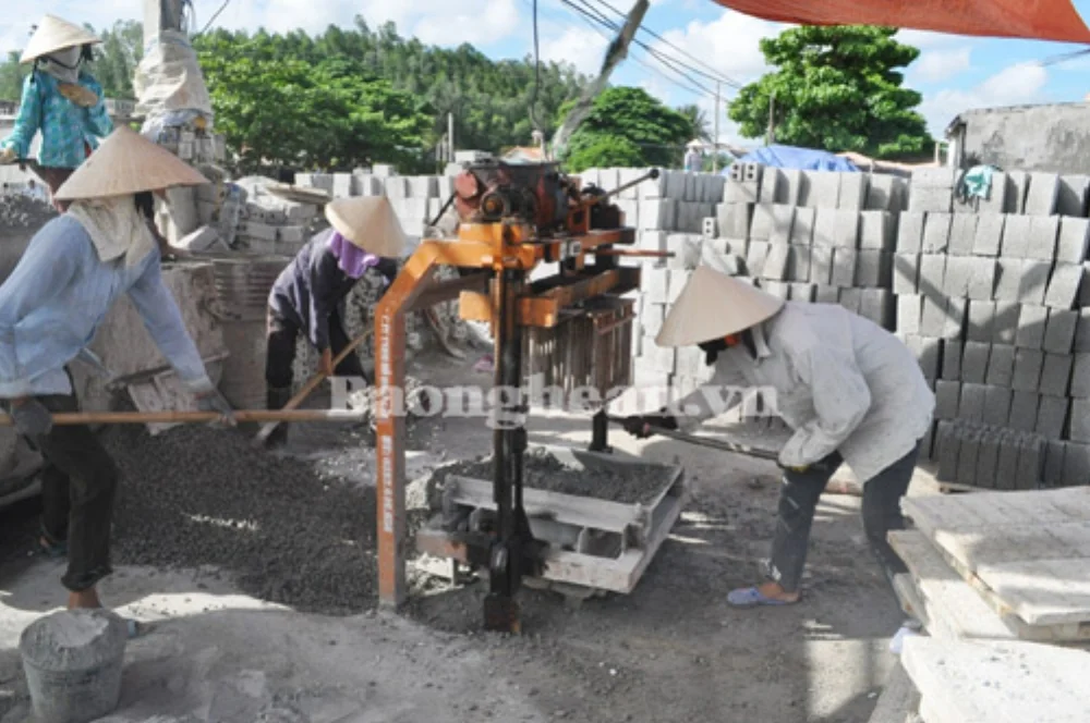 Từ công suất ban đầu 2000 viên/ca nay cải tiến đạt công suất 6.000 viên/ca. Từ máy ép bằng cơ học nay chuyển sang máy ép tự động. Đây là dây chuyền sản xuất vật liệu xây dựng giá rẻ: nguyên liệu là bột đá, cát sỏi, đá 0,5; đá 1x2 cùng với xi măng qua máy nhào trộn thành hỗn hợp, đóng ép trong 2 đến 3 ngày là sử dụng xây dựng được ngay.