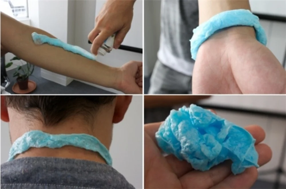 Không phải ngạc nhiên khi thấy những vòng cổ, vòng tay màu xanh bằng bọt thế này. Người dân Nhật Bản rất biết cách làm bản thân thoải mái khi phát minh ra loại chai xịt làm mát này.