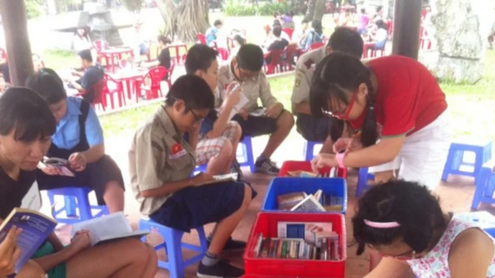 Một hôm, thấy có rất nhiều người tập trung đọc sách trong một căn chòi ở công viên, nên chúng tôi cũng ghé vào lấy sách đọc.