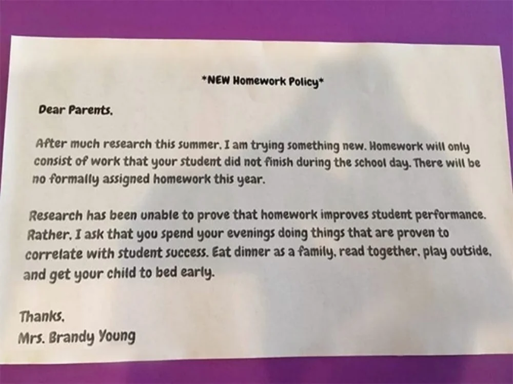 Sau rất nhiều nhiều nghiên cứu trong mùa hè này, tôi đang áp dụng một sự đổi mới. Bài tập chỉ tồn lại nếu học sinh không hoàn thành trong ngày. Năm nay sẽ không có việc giao bài về nhà.