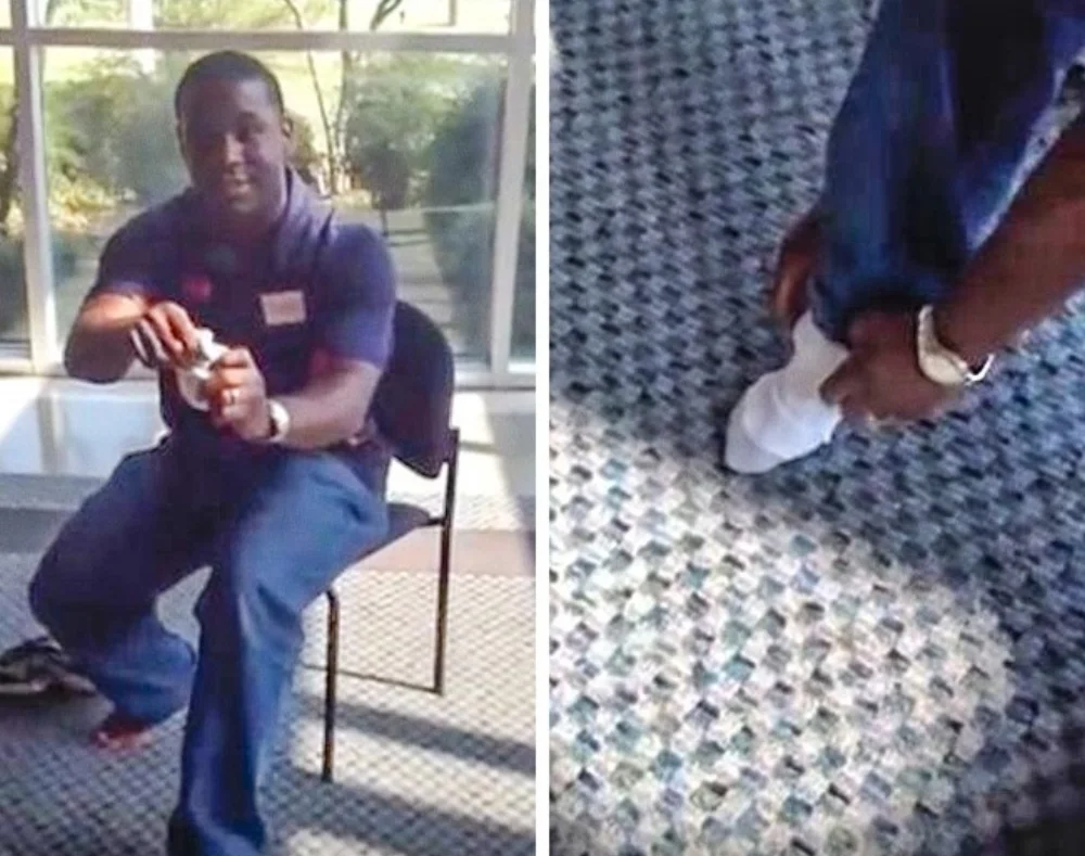 7. Thầy giáo minh họa cách dùng bao cao su bằng cách dùng vớ xỏ vào chân vì trường không cho phép học điều này trong lớp An toàn giới tính