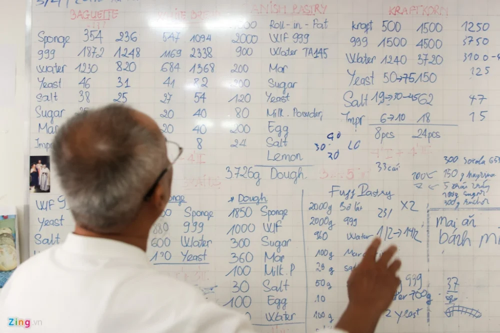 Bảng công thức chất liệu bánh do thầy biên tập và các học sinh đều phải thuộc lòng trước khi vào bếp.