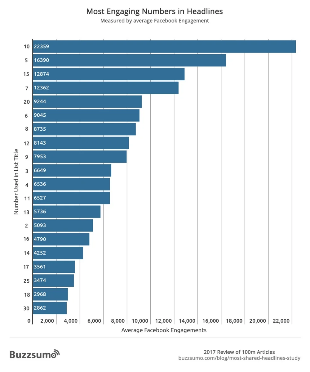 Nhiều tiêu đề đạt được nhiều tương tác là các tiêu đề liệt kê. Ví dụ, tiêu đề bắt đầu bằng con số. Đây là dạng bài viết nhận được nhiều lượt chia sẻ trên mạng xã hội.