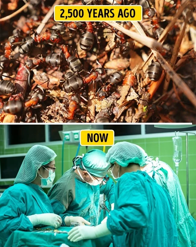 Tổ tiên của chúng ta đã sáng tạo phương pháp này từ trước Công Nguyên. Lúc bấy giờ, họ không có công cụ để khâu vết thương nên đã dùng kiến thay thế. Phương pháp kì lạ này thậm chí phổ biến đến tận thế kỉ thứ 7.