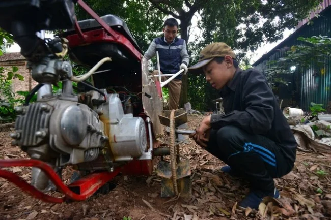 Từ những phụ tùng hoàn toàn được tận dụng từ bộ phận của xe máy cũ tưởng chừng bỏ đi, qua bàn tay khéo léo và trí sáng tạo của anh Huy đã trở thành "cánh tay phải" của bà con trong canh tác nông nghiệp.