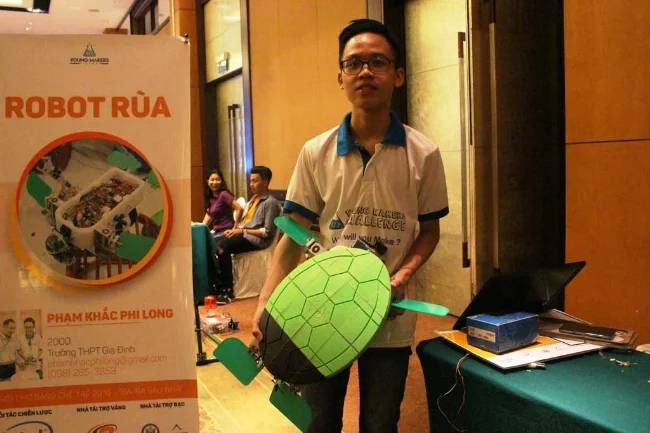Thế là, cậu phải nhờ sự trợ giúp của các anh chị đi trước. Để sản phẩm có tính thẩm mỹ, Phi Long lên ý tưởng thiết kế robot với hình dáng chú rùa biển, thân thiện môi trường. “Các bộ phận lớn được gia công bằng máy tại xưởng cơ khí.