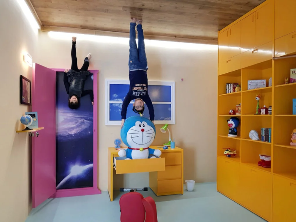 Ở đây có các phòng đảo ngược với cảnh siêu thị đẹp mắt, phòng ngủ dễ thương, nhà bếp theo kiểu Hello Kitty cực lạ, phòng của chú mèo Đoremon đáng yêu... Đặc biệt, tại đây còn có 2 phòng nghiêng 90 độ là không gian quán ăn và salon tóc vô cùng độc đáo.