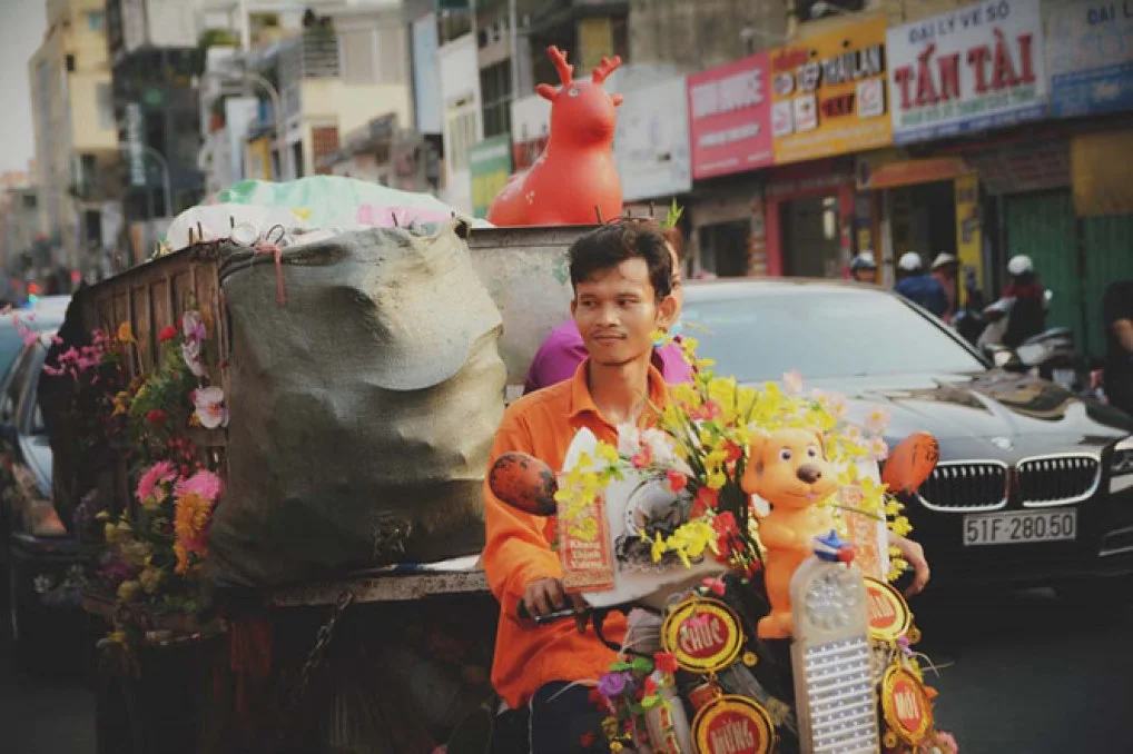Vẫn là một chiếc xe máy cà tàng kéo theo thùng chở rác, nhưng chiếc xe này lại được trang trí đẹp mắt bởi bông hoa, liễn, thú nhồi bông, đèn LED, quạt gió,… thậm chí còn có thể phát ra tiếng nhạc nữa.