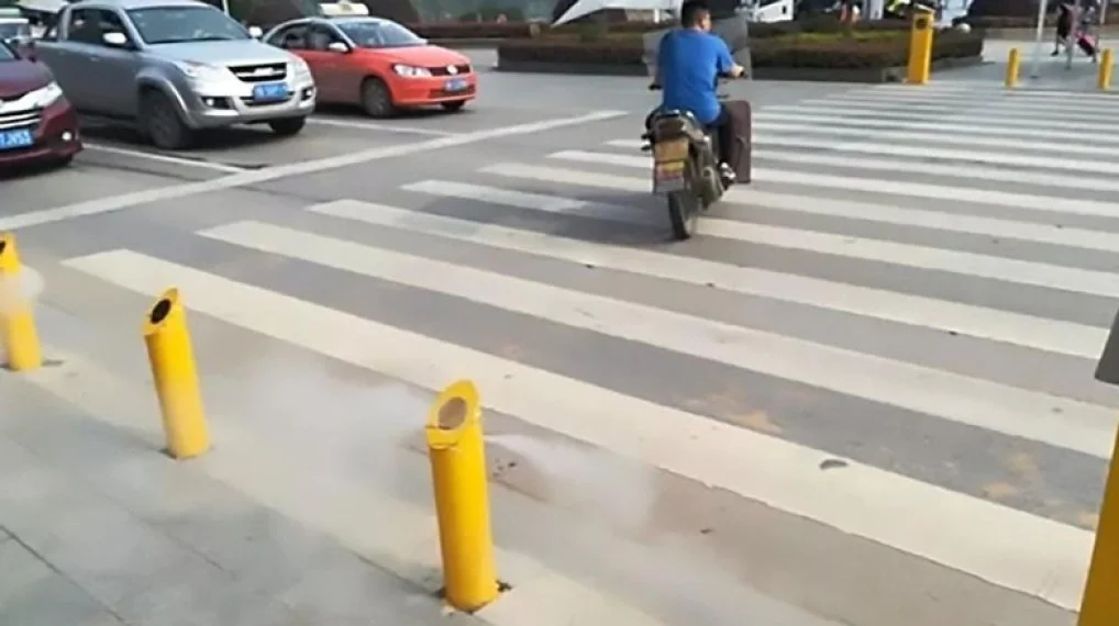 Cảnh sát giao thông ở Daye, tỉnh Hồ Bắc (Trung Quốc) đã nghĩ ra một thiết bị cảm ứng phun nước để ngăn không cho người đi bộ sang đường khi chưa có đèn xanh.