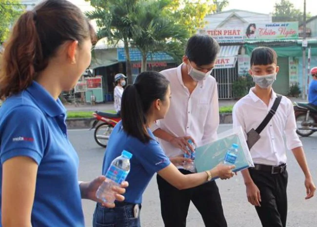 Như tại tỉnh Vĩnh Long, ngoài những băng rôn tuyên truyền treo ở một số tuyến đường để cổ vũ tinh thần của các thí sinh tự tin dự thi, Mobifone Vĩnh Long đã đồng hành “tiếp sức” khi hỗ trợ 2.000 chai nước suối miễn phí cho các thí sinh và phụ huynh.