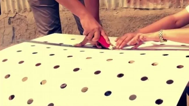 Bạn lấy một miếng bìa các tông lớn, tương đương với diện tích ô cửa sổ nhà, rồi khoét các lỗ tròn với đường kính bằng với miệng của chai nhựa.