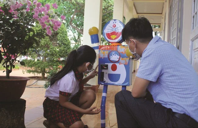 Chiếc máy rửa tay sát khuẩn hình chú mèo máy Doraemon của em Phạm Thị Hoài An, học sinh lớp 4, Trường Tiểu học Nguyễn Thị Minh Khai, xã Đăk R’La, huyện Đăk Mil (Đăk Nông) được đặt tại cổng trường phục vụ thầy và trò trước khi vào trường. Hình ảnh chú mèo máy Doreamon rất thân thuộc, ngộ nghĩnh, có màu xanh dễ thương, các bạn nhỏ luôn thích thú nên khi bước chân vào trường học sẽ gây chú ý, tạo sự gần gũi để thu hút học sinh. Với thiết kế cảm biến, các bạn chỉ cần đưa tay ra, chú mèo Doremon sẽ tự phun dung dịch sát khuẩn.