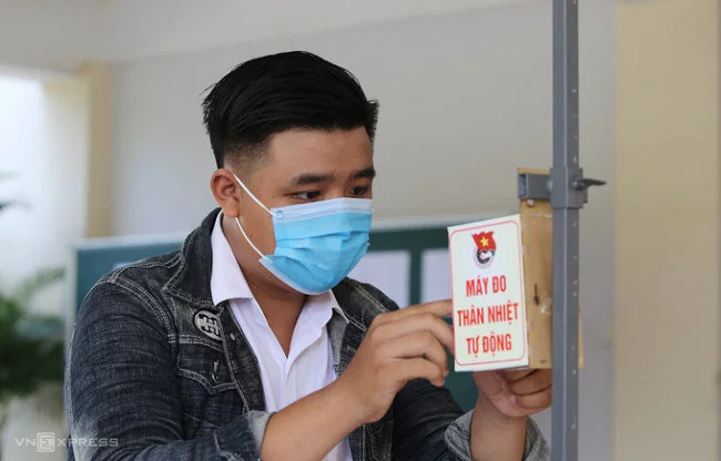Cổng trường được bố trí 10 máy sát khuẩn tự động, thí sinh chỉ việc đưa tay vào thì nước sát khuẩn chảy ra, sau đó tiến đến hai máy đo thân nhiệt tự động. Lần lượt thí sinh cho phần trán áp sát máy, sau hai giây thì nhận được kết quả.