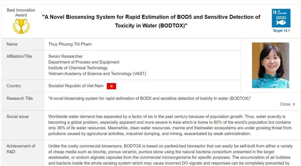 Giải thưởng này vinh danh nghiên cứu của TS Phạm Thị Thùy Phương và các cộng sự vì đã tạo ra hệ nghiên cứu cảm biến sinh học cho phép xác định giá trị BOD và độc tính trong nước chính xác với hệ số biến thiên thấp, thời gian phân tích nhanh, dễ sử dụng... để xác định nhanh chất lượng nước thải.