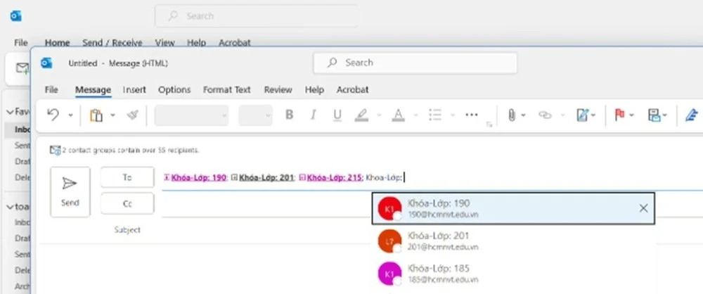 Thông qua ứng dụng Outlook, là một hộp thư điện tử dùng để trao đổi thông tin. Khi người dùng muốn liên lạc đến một khối, lớp hay một cá nhân nào đó trong tổ chức thì đều có thể tìm kiếm truy xuất dễ dàng (Hình 5).