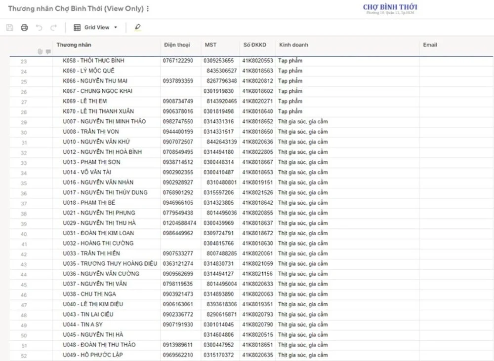 Xem danh sách thương nhân tại chợ
