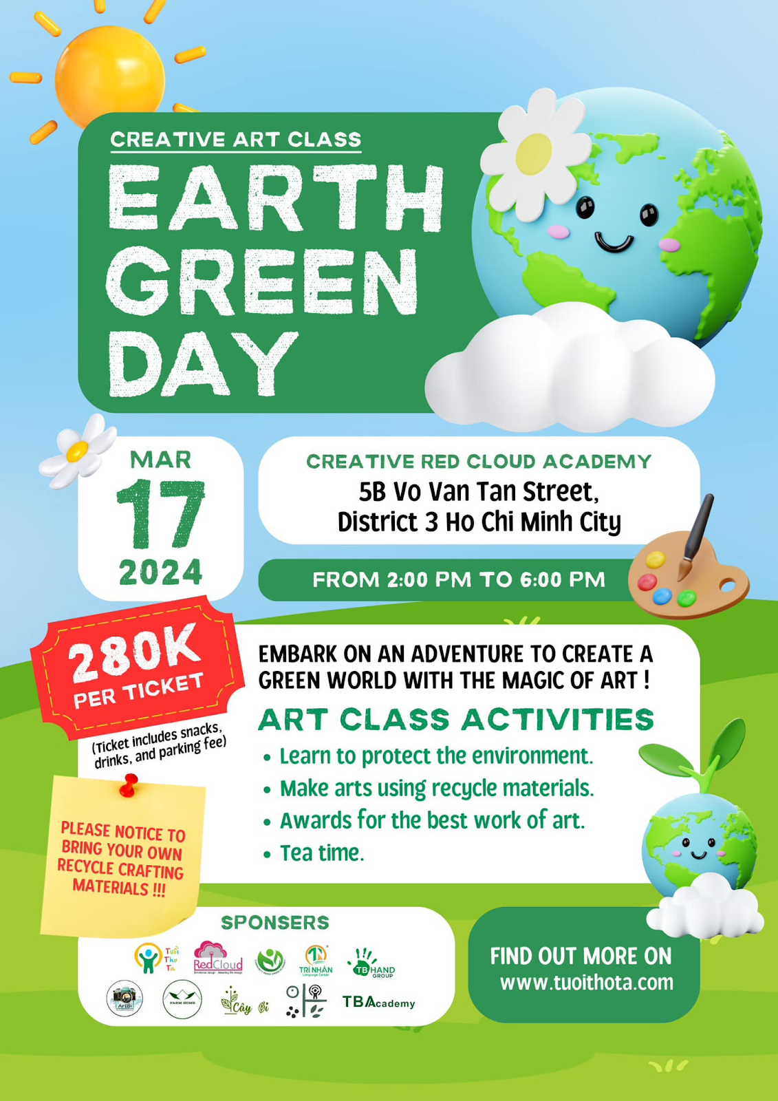 ‘EARTH GREEN DAY’ một workshop Ngày môi trường ý nghĩa được tổ chức từ ‘Tuổi thơ ta’ cùng với ‘Học viện sáng tạo Mây đỏ’. Các bé được trang bị những kỹ năng và kiến thức cơ bản để bảo vệ môi trường, không giới hạn sự sáng tạo để tạo nên những tác phẩm nghệ thuật độc đáo từ vật liệu tái chế. Từ đó nâng cao ý thức bảo vệ môi trường và sử dụng tài nguyên thiên nhiên tiết kiệm cho trẻ em.