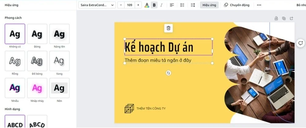4. Cách tạo hiệu ứng trên canva: Chọn mục hiệu ứng trên canva, sau đó chọn loại hiệu ứng cần.