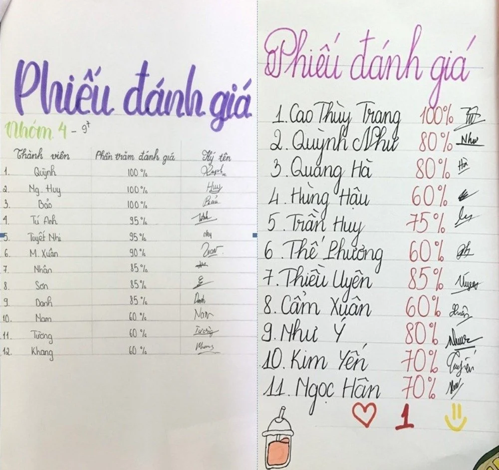 Phiếu đánh giá mức độ đóng góp của thành viên trong nhóm.
