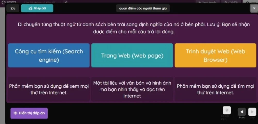 Nhập nội dung câu hỏi, cho điểm, chọn đáp án đúng và cuối cùng nhấn Save, người chơi kéo vào với hai nhóm đối tượng đã cho, phải ghép nối một đối tượng của nhóm thứ nhất với một đối tượng của nhóm thứ hai thỏa mãn yêu cầu của bài.