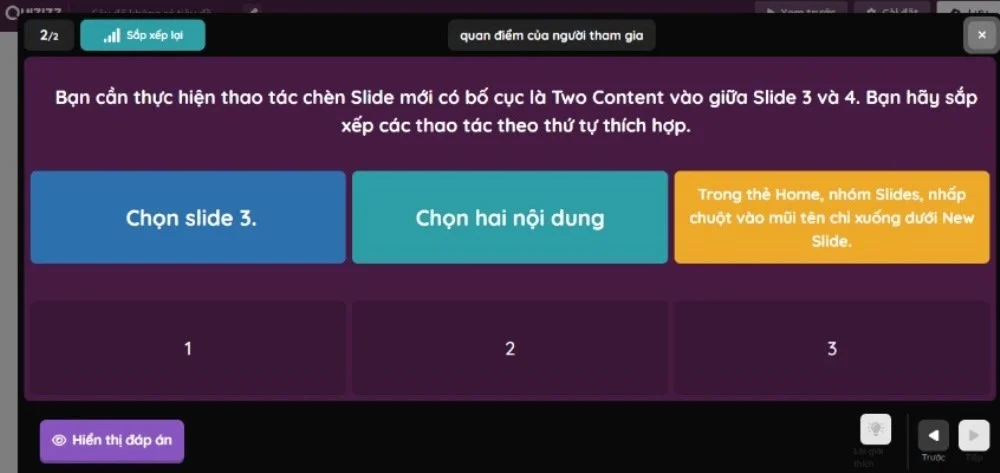 Nhập nội dung câu hỏi, cho điểm, chọn đáp án đúng và cuối cùng nhấn Save, người chơi sẽ kéo đáp án vào các vị trí 1, 2, 3.