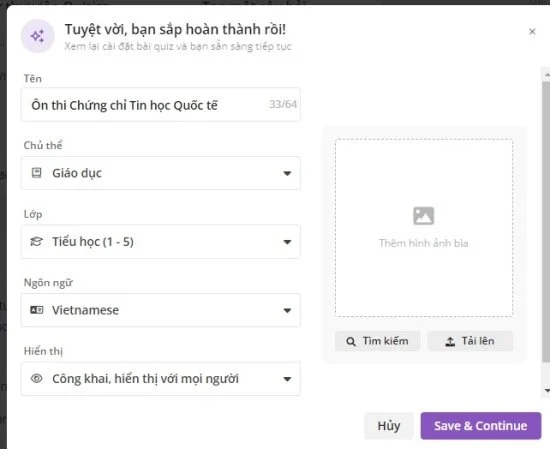 Sau khi hoàn thành các câu hỏi cho bài kiểm tra, thầy cô có thể cài đặt một số thông tin thêm cho bài kiểm tra của mình.