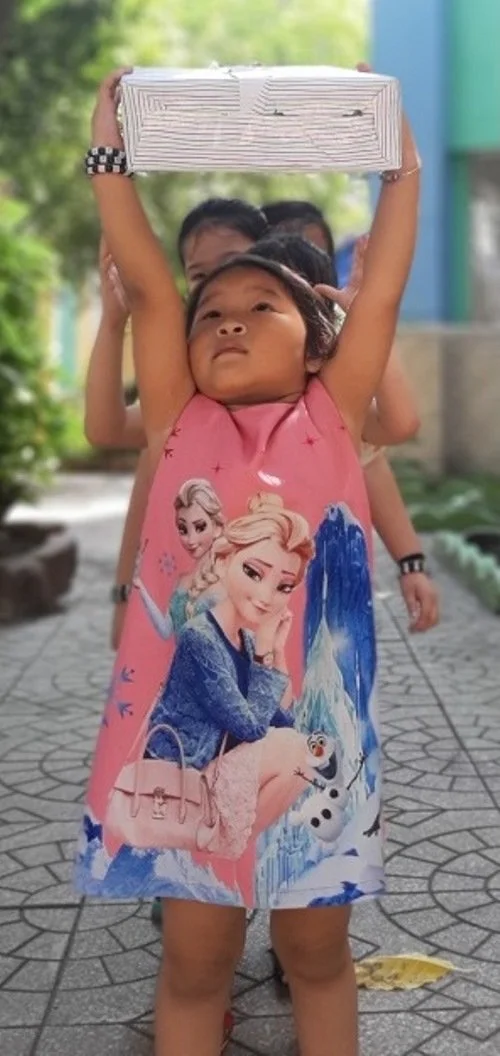 Trẻ đứng vào trong thùng mô hình xe, hai tay cầm hai bên thùng xe rồi di chuyển đi, chạy nhanh, chậm...như xe ôtô đang chạy.