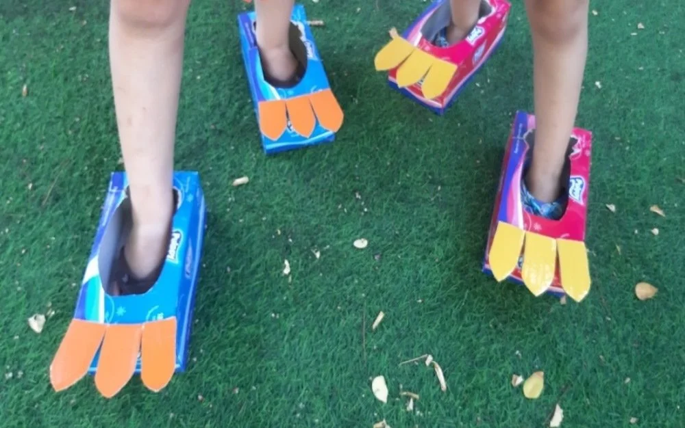 Trẻ dùng chân mang vào những chiếc dép cô đã dán trong mặt trong của hộp giấy rồi di chuyển các bước chân.