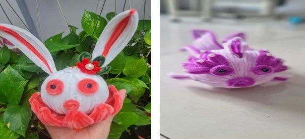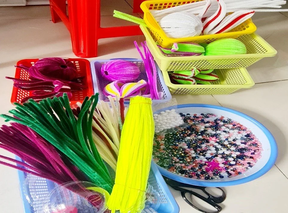 Công đoạn thực hiện cũng không quá phức tạp. Đầu tiên, chúng ta gắn nắp nhựa tạo thành một khối cầu bằng keo hoặc buộc kẽm. Sau đó dùng kẽm nhung quấn quanh khối cầu vừa tạo.